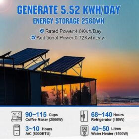 [Package Includes]: 6*195W mono solar panels + 1* 60A MPPT controller + 1* 24V 3000W Pure Sine Wave Inverter + 1*25.6V 100Ah lithium battery + 1*Bluetooth Module + different equipment wanted.