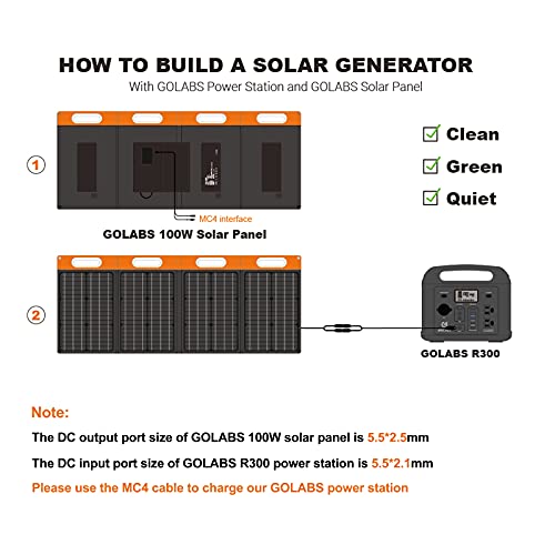 WHAT YOU WILL GET: 1* GOLABS SF100 100W solar panel, 1* DC to DC cable, 1* DC to Anderson cable, 10* connectors, 4* fastened pegs. 1* GOLABS i200 energy station, 1* AC wall charger, 1* automobile charger cable, 1* MC4 charging cable, 1* consumer guide.