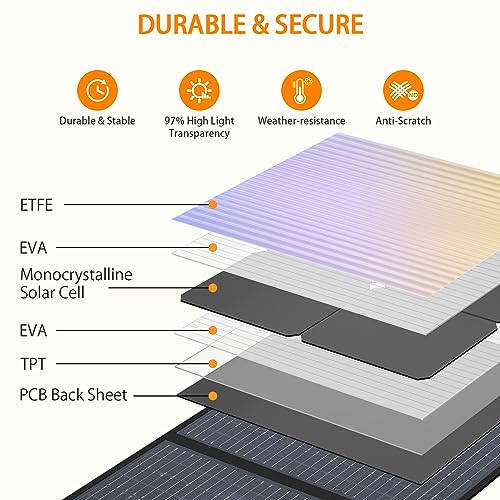 WATERPROOF & DURABLE – Its advanced ETFE laminated technology, a heat-resistant dustproof and waterproof film on the surface, and 840D Oxford cloth outer, prevent damage of the cells due to moisture and sun and make it more durable, scratch-resistant, and moisture-proof. It is IP65 waterproof which will protect it from water splashing, and withstand a variety of weather conditions, making it ideal for outdoor adventure. (Do not place it under the rain, or soak it in water).